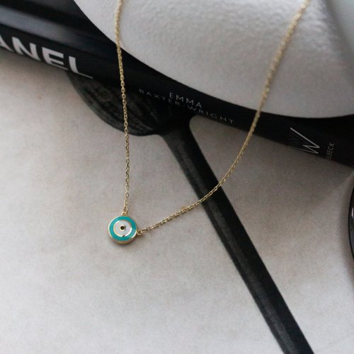 10k Yellow Gold Turquoise Enamel Evil Eye Necklace