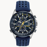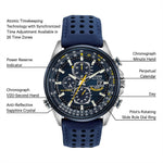 The Blue Angels World Chronograph A-T comes equipped with atomic clock synchronization for superior accuracy. This perpetual calendar chronograph is radio-controlled and shows time in 26 time zones. Featured in a stainless steel case with a blue polyurethane coated leather strap, this timepiece additionaly features a 1/20-second chronograph that measures up to 60 minutes, 12/24-hour time, a power reserve indicator, a pilot's rotating slide rule dial ring and an anti-reflective sapphire crystal. The official Blue Angels insignia appears on the watch caseback. Water resistant up to 200 metres.