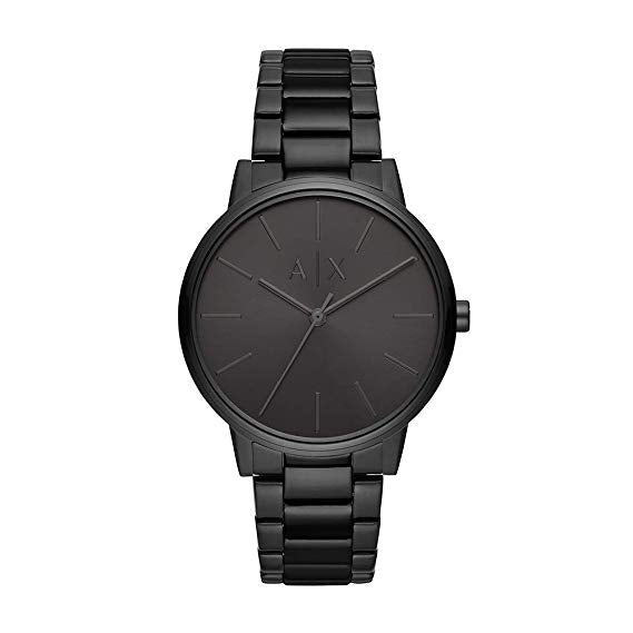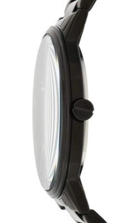 This 42mm watch features a black sunray dial with silver-tone stick indexes, three-hand movement and black stainless steel bracelet.