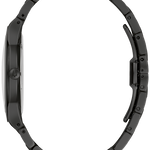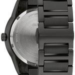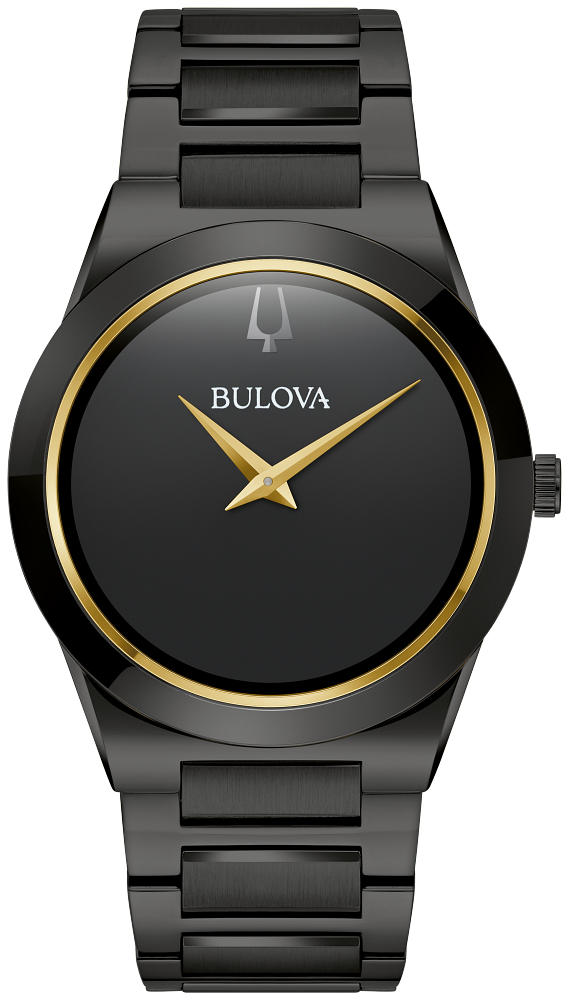 A masterclass in modern design, this sophisticated timepiece from the Bulova men s Modern collection will add a contemporary edge to your wardrobe. The black IP stainless steel case design features a metalized domed edge-to-edge sapphire crystal that extends to form the black bezel of the timepiece, while a sleek silhouette flows seamlessly into a matching black IP stainless steel bracelet with brushed centre links and a push-button deployant closure for a sleek profile. A gold-tone case ring encircles the dramatic black dial, which pushes the limits of minimalism with no markers and angular gold-tone hands. An uncompromising commitment to modern design, this Bulova men s timepiece will push any wardrobe beyond convention.