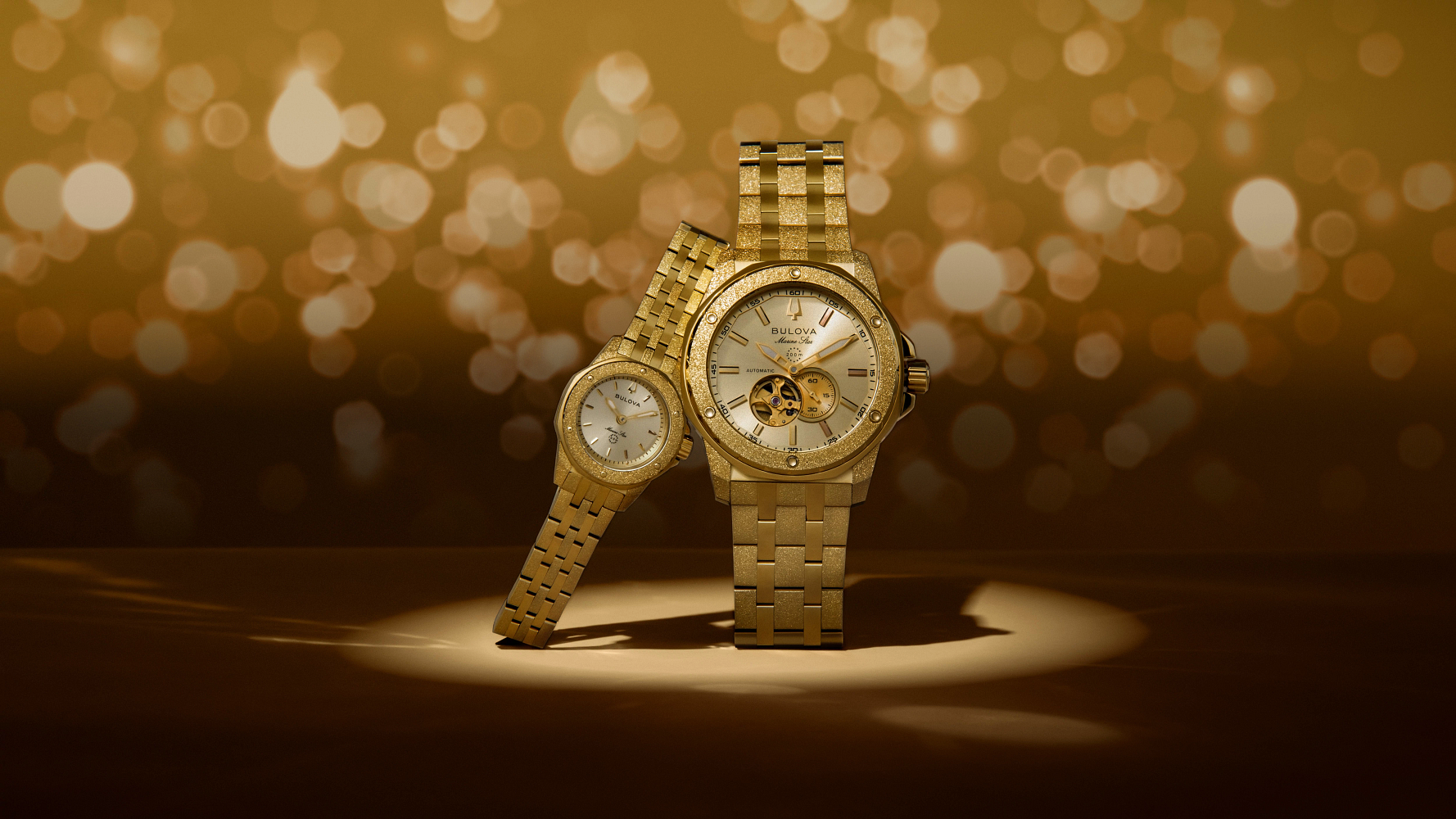 Combining classic nautical styling with contemporary flair, this Bulova Marine Star men’s watch captures a legacy that reaches back decades and captures the incredible spirit of legendary musician Marc Anthony. Bold and angular, the gold-tone stainless steel case is defined by textured iced finishing with polished accents and a gold-tone bezel. Elevating the timepiece’s luxurious aesthetic, a radiant gold-tone dial features matching hands and hour markers, each with luminescent material, with rose gold-tone accents at 1, 3, and 5, numbers with personal significance to Marc Anthony. Visible through both a dial aperture and a smoked exhibition caseback with Anthony’s signature, the open heartbeat automatic movement features 21 jewels and a 42-hour power reserve. Completed with a matching gold-tone stainless steel bracelet with a push-button clasp and delivering 200 meters of water resistance, this new Bulova Marine Star from the Marc Anthony collection is equipped to handle the rhythms of a life well lived.