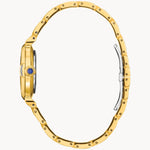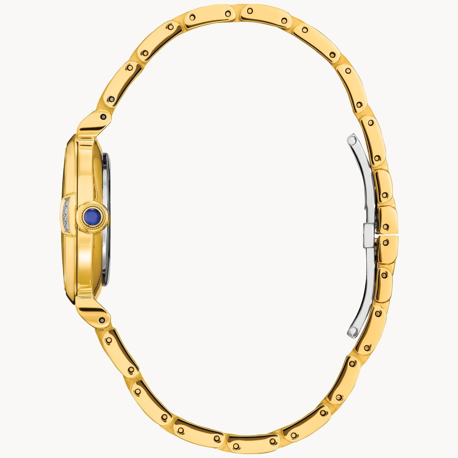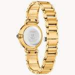 Classic lines and hints of romance make this newest piece to our ladies' collection, the Citizen L Mae, a glamorous addition of sustainable luxury. With a case design inspired by a vintage perfume bottle and featuring the curved, sleek lines of May bells, the bezel shape has a distinct feature at the 3 o clock position, where the crown resembles an elegant perfume stopper. Featuring a white, mother-of-pearl dial made of recycled materials from the shell of pearl oysters that are discarded after harvest, and showcased on a sleek, gold-tone stainless steel case and bracelet. The dial also has a diamond that gives focus to the 8 o clock position and is finished with a sapphire crystal. Sustainably powered by any light with our proprietary Eco-Drive technology that never needs a battery, this elegant women s watch is the perfect dressed up look with high-powered performance. Caliber E031.