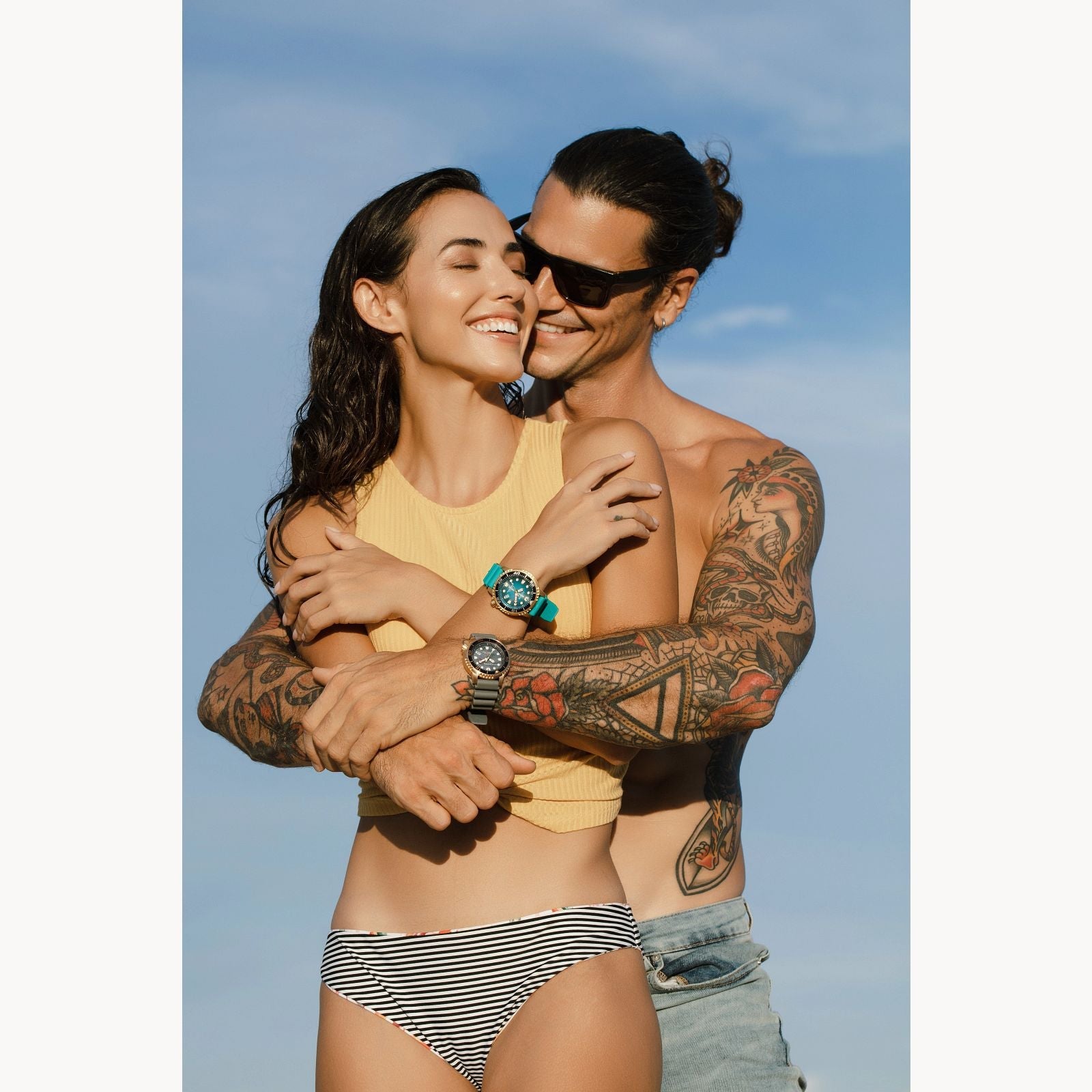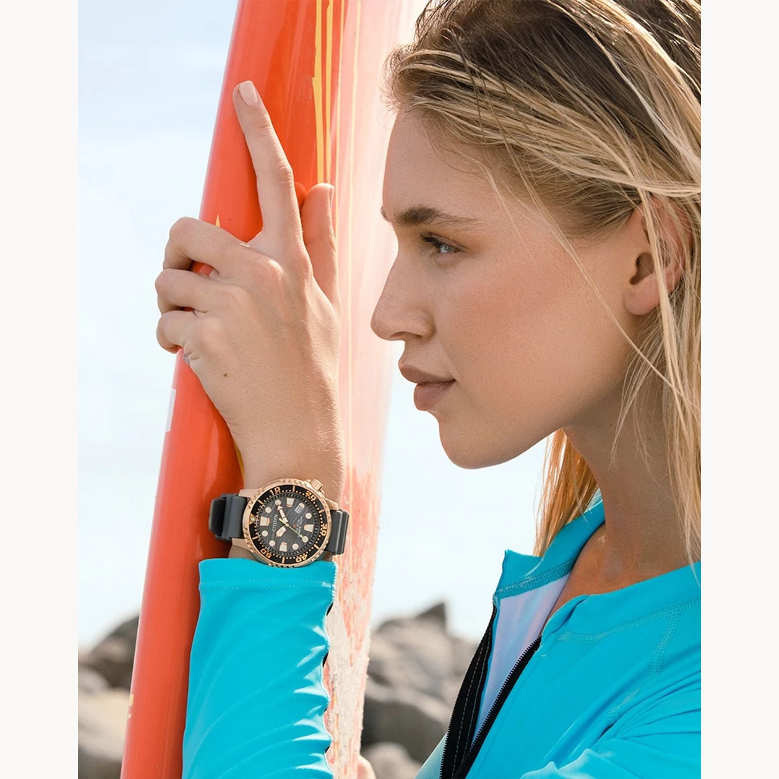 Explore the deepest depths with the latest Promaster Dive in a stylish new colour. This must-have diving watch vibrantly features a rose gold-tone stainless steel case, a grey 3-hand dial with date function, and luminous hands and markers. The durable, grey polyurethane strap with buckle closure completes the look for a comfortable fit. Featuring our sustainable Eco-Drive technology powered by any light that never needs a battery, you ll wear this high-performance timepiece in high style from adventures on land to the deep blue sea. ISO compliant and water resistant to 200 metres. Calibre E168.