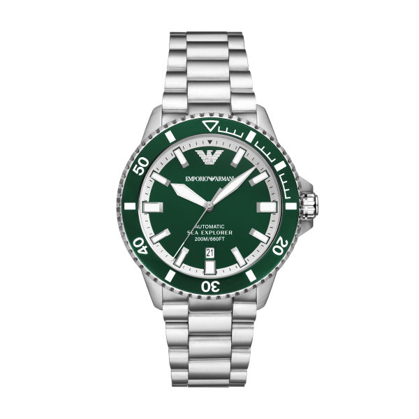This 42.5mm watch features a glossy green enamel dial, green aluminum bezel insert, Super-LumiNova on hands, indexes and bezel markings, sapphire crystal, automatic movement, 20 ATM, a screwed crown and stainless steel bracelet.