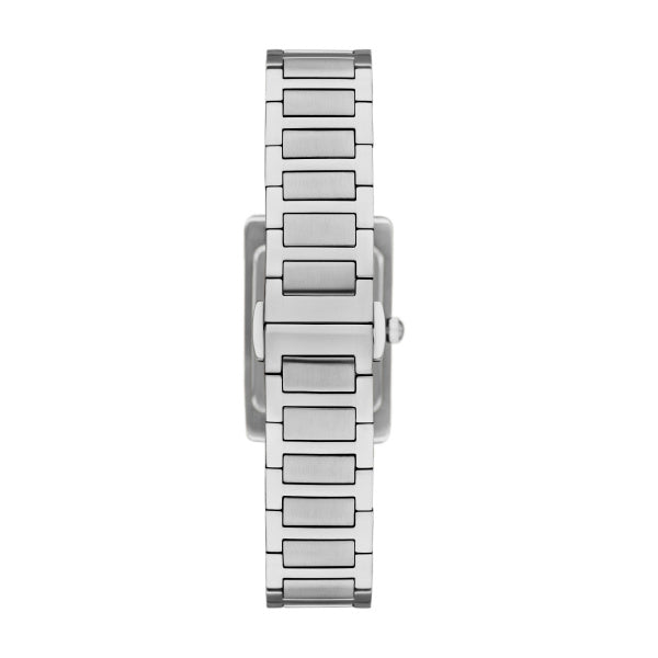 This 25 x 38mm stainless steel watch is distinguished from the crowd. Featuring a sleek rectangular case and a two-hand date quartz movement, this timepiece stands out with its glossy mother-of-pearl dial adorned with black Roman numeral indexes. The stainless steel H-link bracelet adds a touch of refinement, making it perfect for any dress occasion.