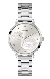 An elegant piece that features a floral dial and genuine Swarovski crystal markers.