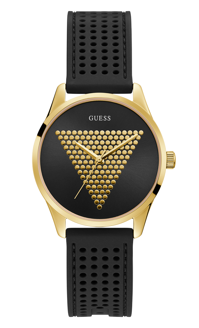 Keep your look iconic with this black analog watch, complete with a silicone strap, gold-tone trim and logo triangle detail. Gold-tone stainless steel case.