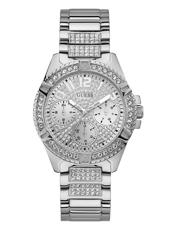 A silver-tone multifunction watch that will add elegance to your everyday look. Complete with rhinestone embellishments and a logo detail. Day, date and international time dials.