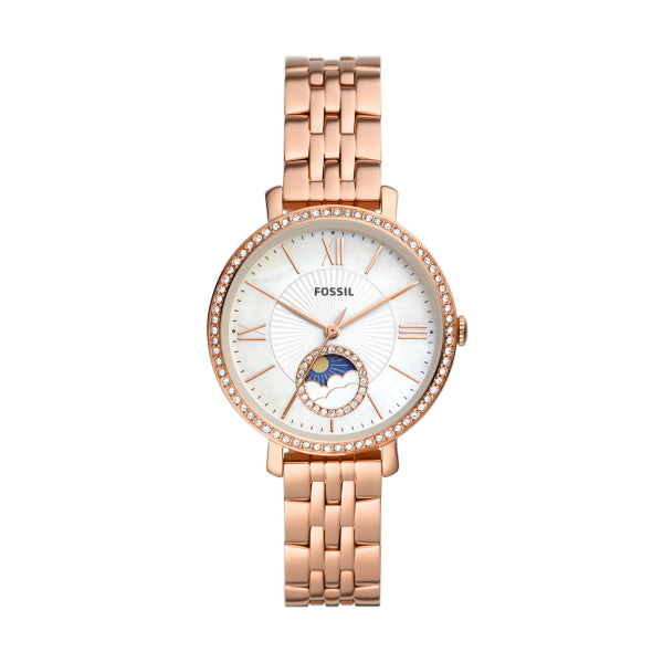 This 36mm Jacqueline features a white mother of pearl glossy and textured dial, sun moon multifunction movement and rose gold-tone stainless steel bracelet.