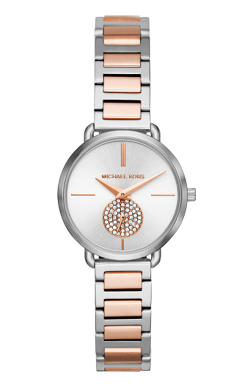 Add a touch of high-shine glamour to any look with our Portia two-tone watch. Its minimalist silhouette is accented by a pav -studded sub-eye display for a chic and functional finish.