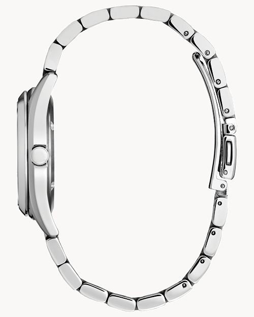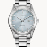 When sporty style meets luxury, you get this latest stunner from Citizen. Joining ready-for-anything wearability with feminine elegance, this time-and-date timepiece is the ultimate day-to-evening watch to wear. The silver-tone stainless steel case measures 33mm in diameter and is presented on a silver-tone, 3-link stainless steel bracelet for a sleek, versatile wear on the wrist. The radiant blue dial is characterized by its highly legible style and diamond accents, elevating the sporty wearer one step further. A water resistance up to 100 metres helps the dynamic watch maintain a host of functionality without compromising its alluring appearance. Powered by Citizen s proprietary Eco-Drive technology to provide light-powered vitality continuously and sustainably without ever needing a battery. Calibre E013.