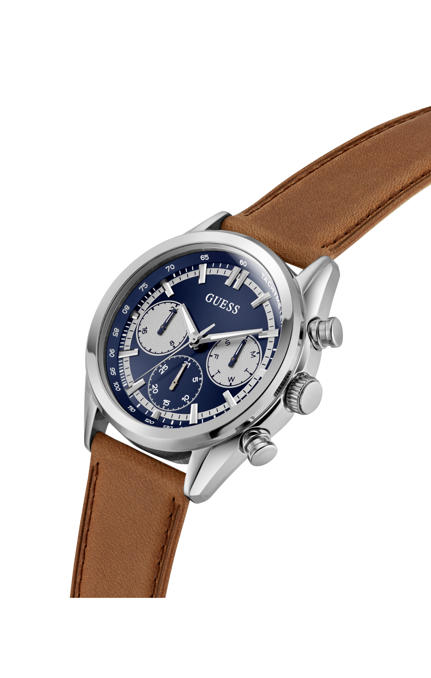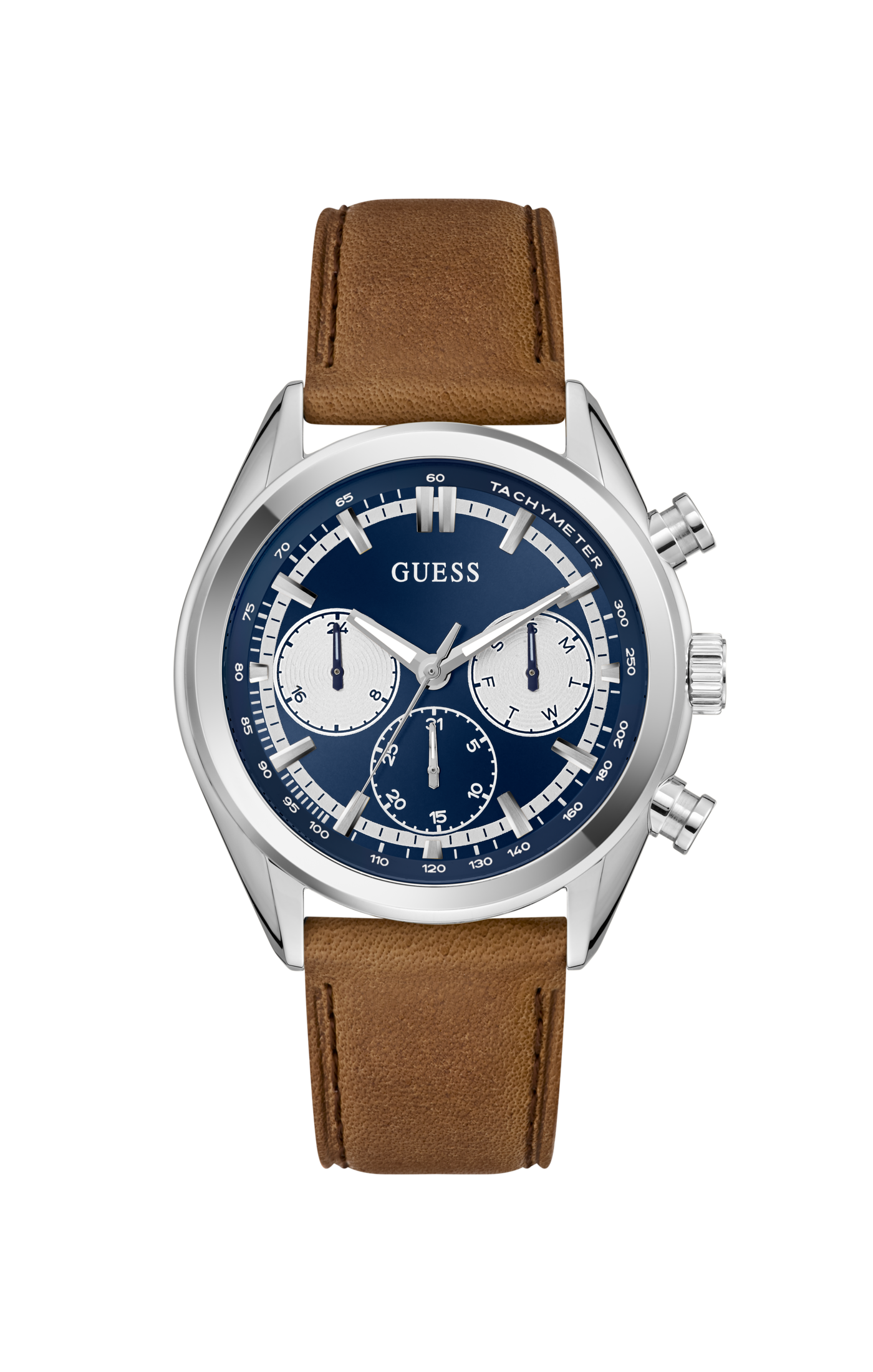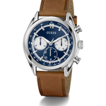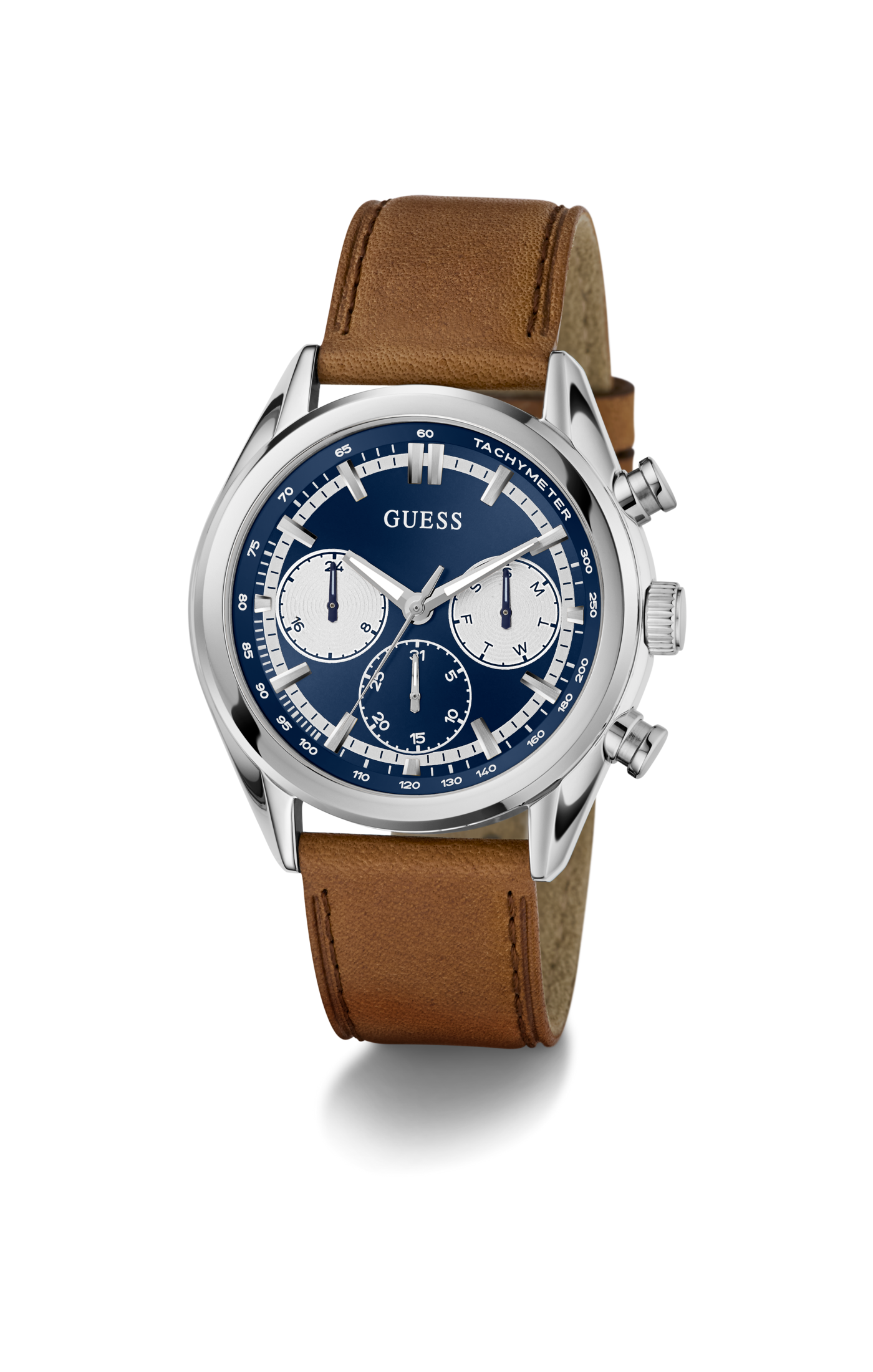 • Silver-tone case with blue dial