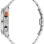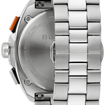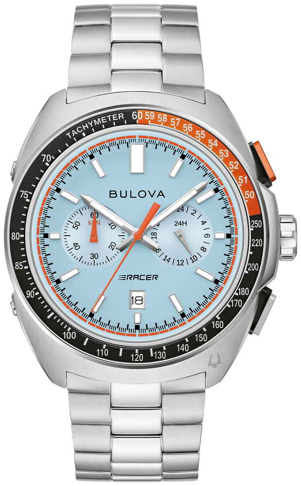 Built on Bulova s vibrant history in motorsport C from soap box derbies to the upper echelons of auto racing C the new men s 5-hand chronograph Racer watch is fine-tuned and designed for performance. The contou"ed stainless steel case features a unique design evoking the aerodynamic curves of the world s fastest automobiles. A two-tone orange and black tachymeter ring offers further functionality, while pronounced pushers provide a distinctively automotive aesthetic. The spectacularly textured light blue dial features an orange and white racing pattern chapter ring, with a date display at 6 o clock and subdials displaying the chronograph minutes and the 24-hour time. A bold orange chronograph seconds hand ensures optimal legibility no matter the speed. The dial is appointed with applied silver-tone markers and matching beveled hands, all filled with luminescent material for low-light visibility. The watch is paired with a 3-link stainless-steel bracelet with a deployant clasp for a secure fit. Whether gripping the wheel around the bend at the track or on your daily commute, the Bulova men s Racer chronograph is a stylish expression of racing history and a passion for speed.
