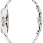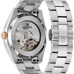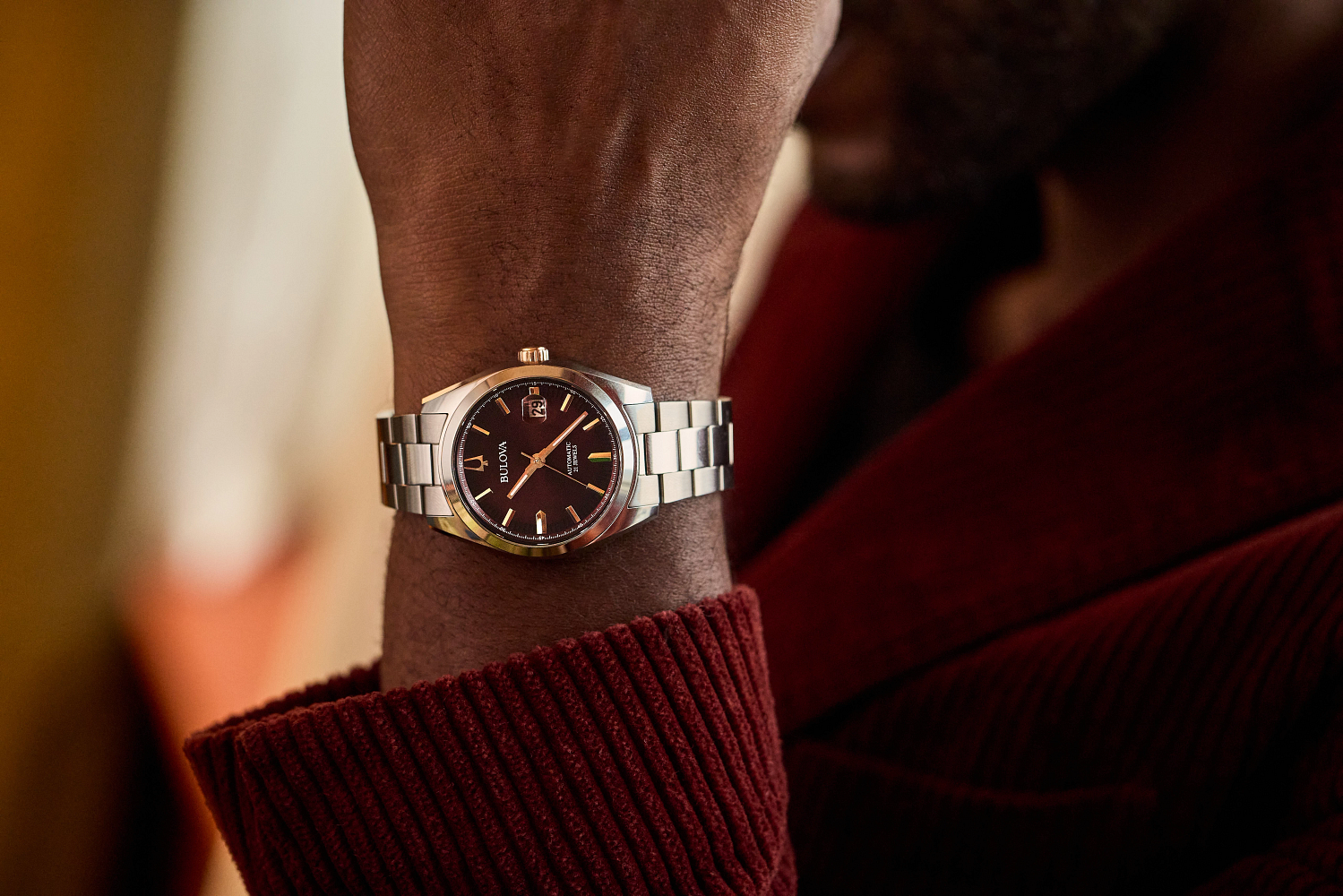 The Bulova men s Surveyor is defined by exceptional quality and sophisticated aesthetics. The silver-tone stainless steel case features sculpted edges and faceting which provide an effortless wear on the wrist, with polished and brushed finishing, a flat sapphire crystal, and a matching quick-release 3-link stainless steel bracelet with a push-button deployant clasp. The rich burgundy dial has a sunburst finish and features rose gold-tone accents, hands with luminescent fill, debossed minute markers, and a magnified date display. The watch is powered by an 21-jewels and a 42-hour power reserve, which can be seen in full through a mineral crystal exhibition window in the caseback. For those with a discerning eye for refined luxury, this Bulova men s timepiece is the obvious choice.