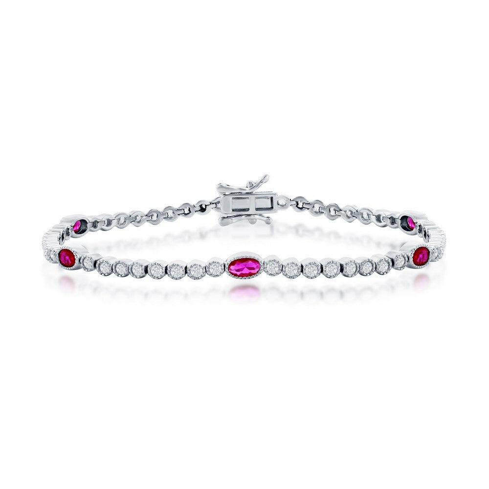 Sterling Silver Beaded Outline Round & Oval CZ Bracelet - Ruby