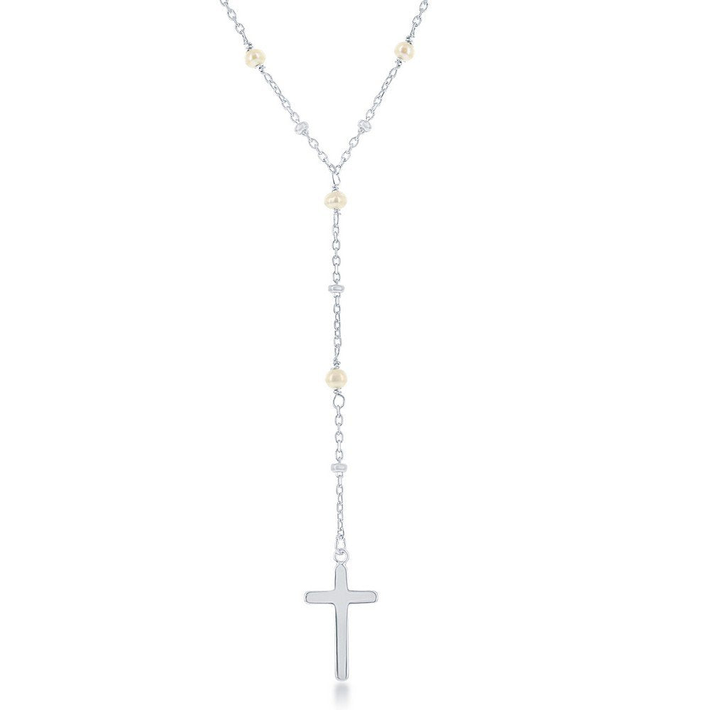 Sterling Silver Freshwater Pearl & Plain Beads by the Yard Cross Rosary Necklace