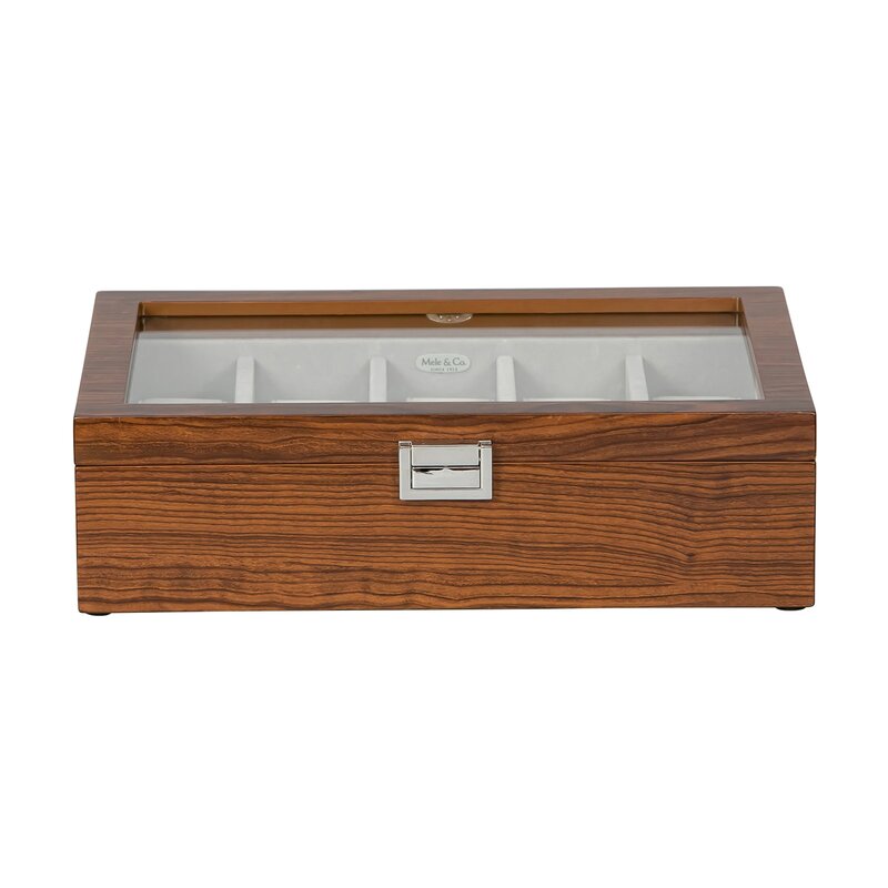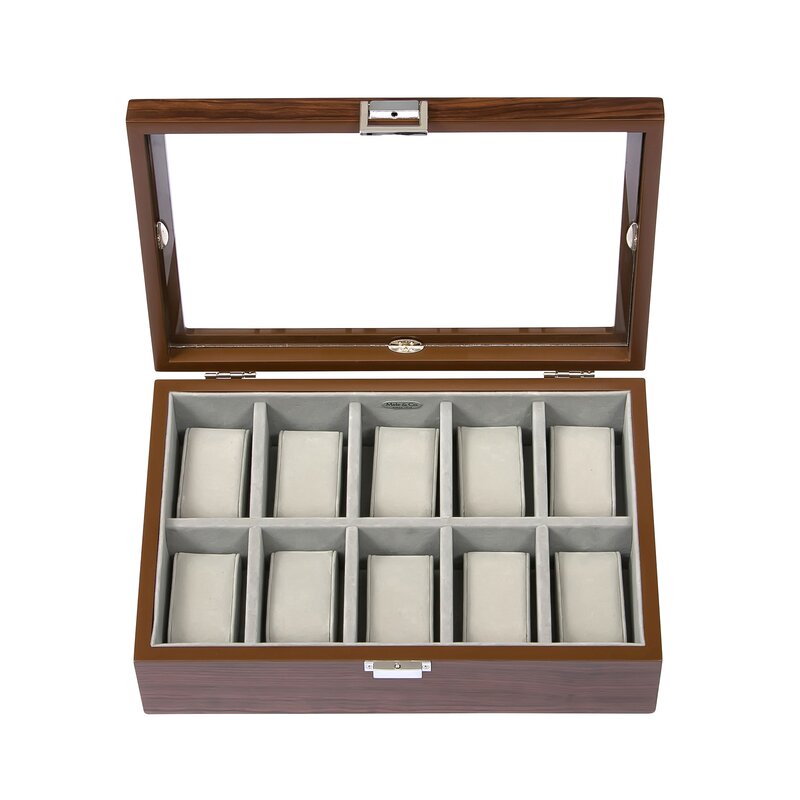With clean contours and ample room for your entire collection, the Mele & Co. Jayson watch case is a fitting complement to the contemporary man's dresser top. Ten sections, Grey lining and a rich mahogany wood grain finish make a sophisticated presentation.