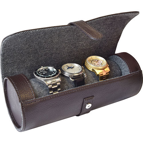 Brown leatherette with pattern print exterior case can hold between 3-5 of your favorite time pieces. The domed closure cover opens to a soft grey suedine interior, and the cushioned inner roll, ensures that your watches are protected against unnecessary wear. This case is great for travel, when you may require an assortment of watches for your planned activities or wardrobe.