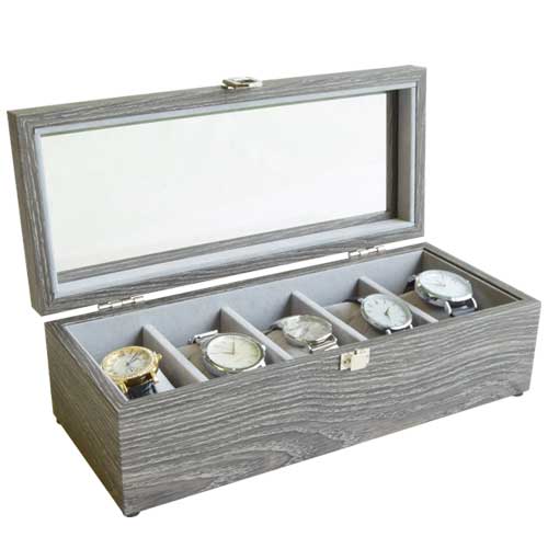 Store your favourite five watches in this modern watch storage case. A sharp looking grey woodgrain paper veneer makes this an attractive addition to your collection. Glass lid, soft grey velour interior and five watch pillows complete the look. It features quality brush matte silver hinges and front latch.
