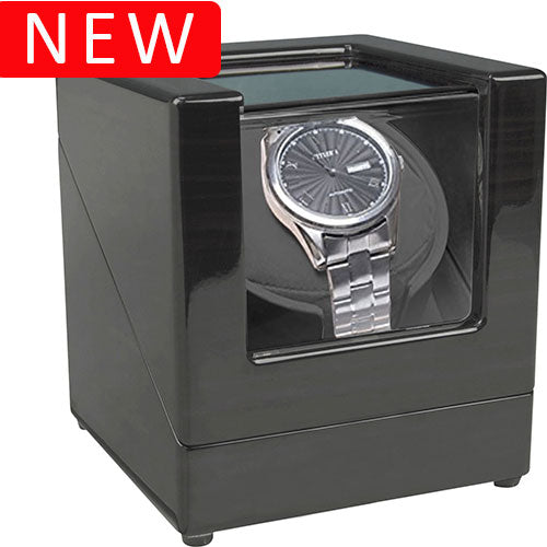 The high gloss, dark grey finish, accented by silver tone hardware, creates a striking yet classic look. A black leatherette lining encases the precision Japanese motor. The pillow rotator cuff will hold even the most delicate of time pieces securely in place without damage. This winder can be powered with the included 110V AC adapter or battery back-up.