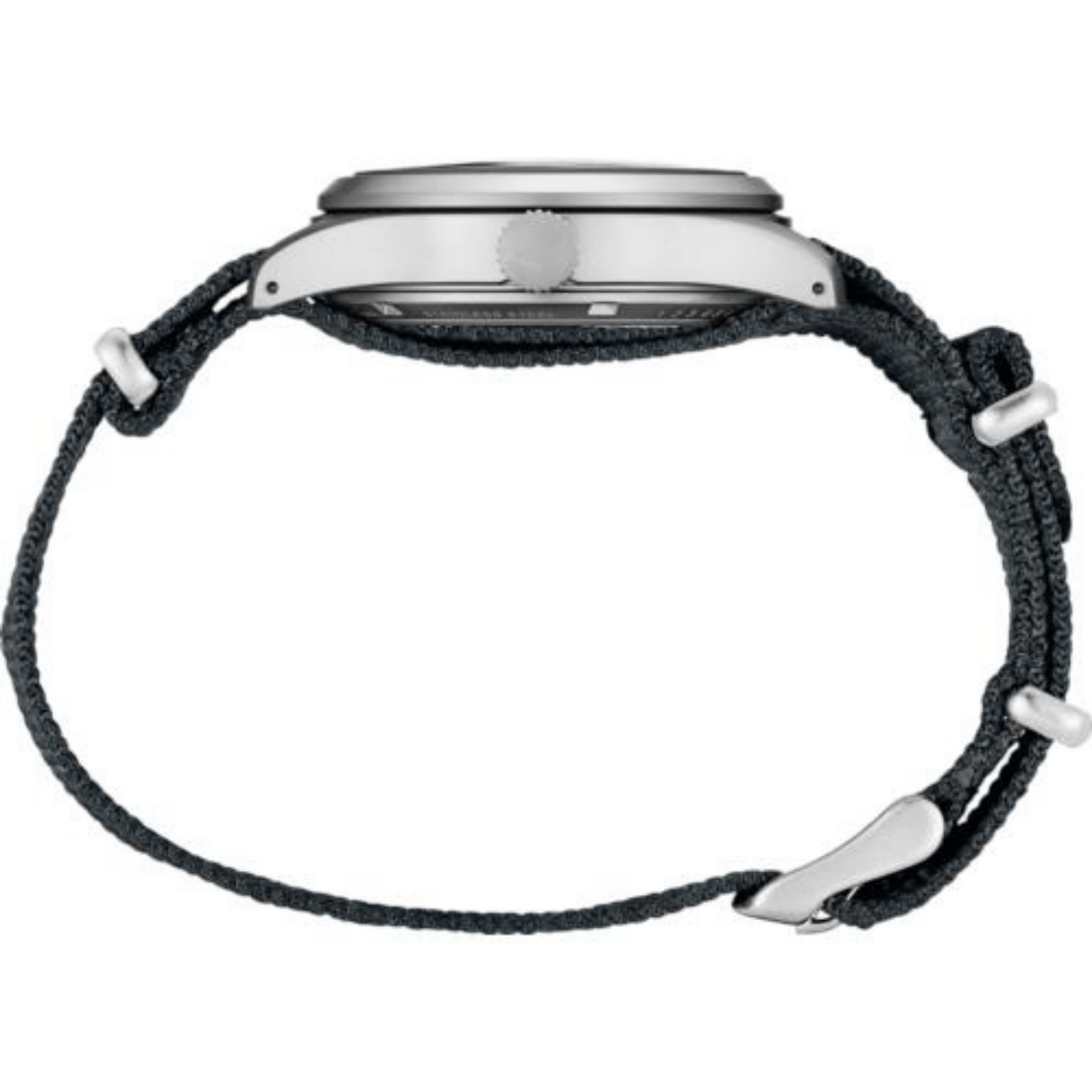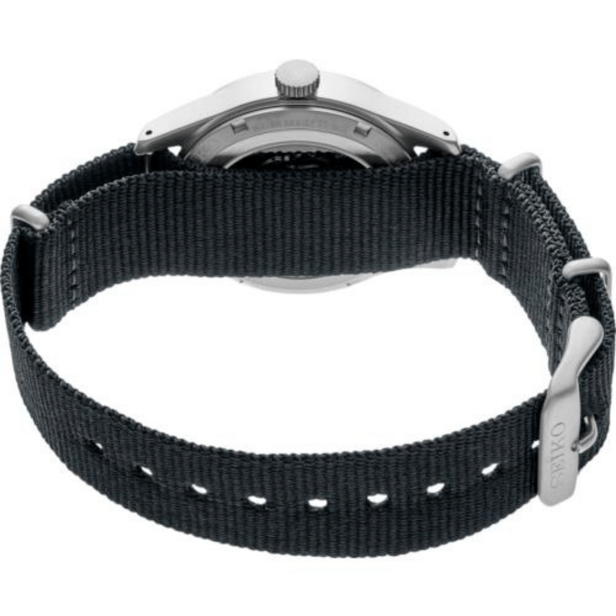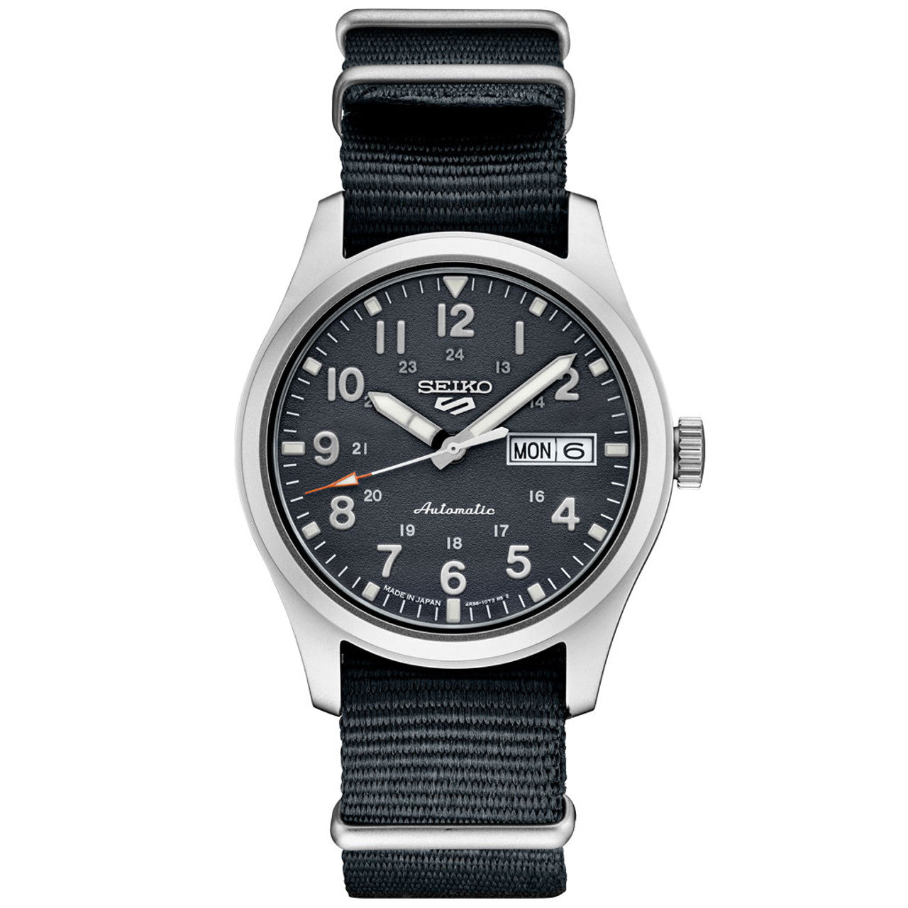 This is a new Seiko automatic 5 Sports watch that features a Seiko 4R36 automatic (self-winding, hand wind, hacks) movement. The grey textured dial has a day and date display at 3:00 and highly luminous hands and hour markers treated with Lumibrite. The dial also features a 24-hour scale for telling military time. The push-pull crown is at 3:00 on the 40mm diameter x 13.5mm thick stainless steel case. Tip to tip measurement is 48mm. There is also an exhibition window (screw-down) case back for viewing the automatic movement. It comes on a matching grey nylon military-style band. Lug width is 20mm. Water resistance is 100 meters.
