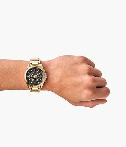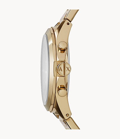 This Armani Exchange watch features a black textured CD-finish chronograph dial and striped inner dial, paired with a brushed-and-polished gold-tone case and H-link bracelet.