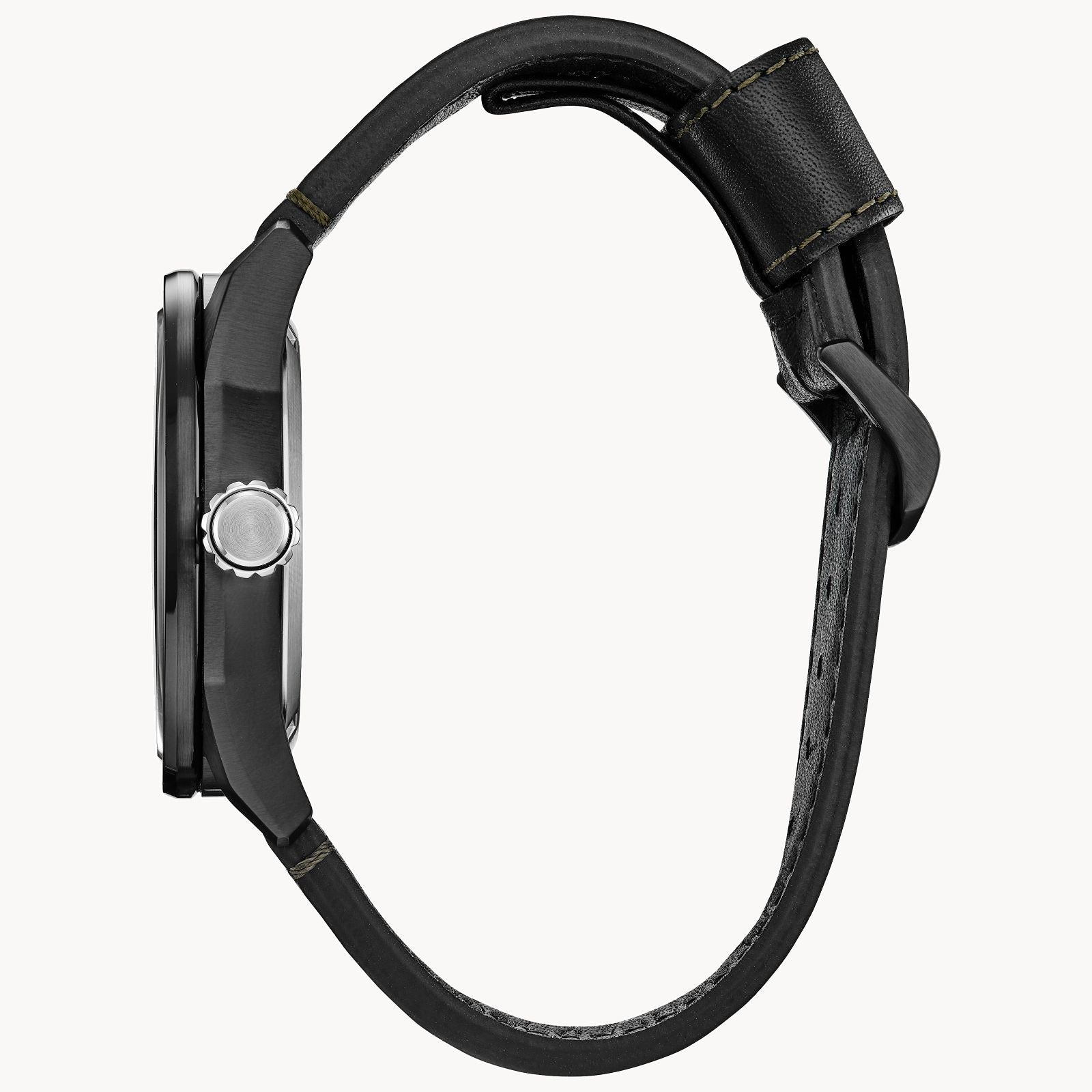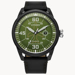 A vintage look from a bygone era, combined with modern technology, make the men s Avion Weekender timepiece from Citizen the watch to wear. This traditionally styled watch features a black stainless-steel case that holds a green three-hand dial with date. The black leather strap with buckle completes the nostalgic look. This Eco-Drive watch is powered by any light source eliminating the need for batteries and is also water resistant up to 100 metres. Celebrate enduring character and contemporary style with the Avion Weekender.