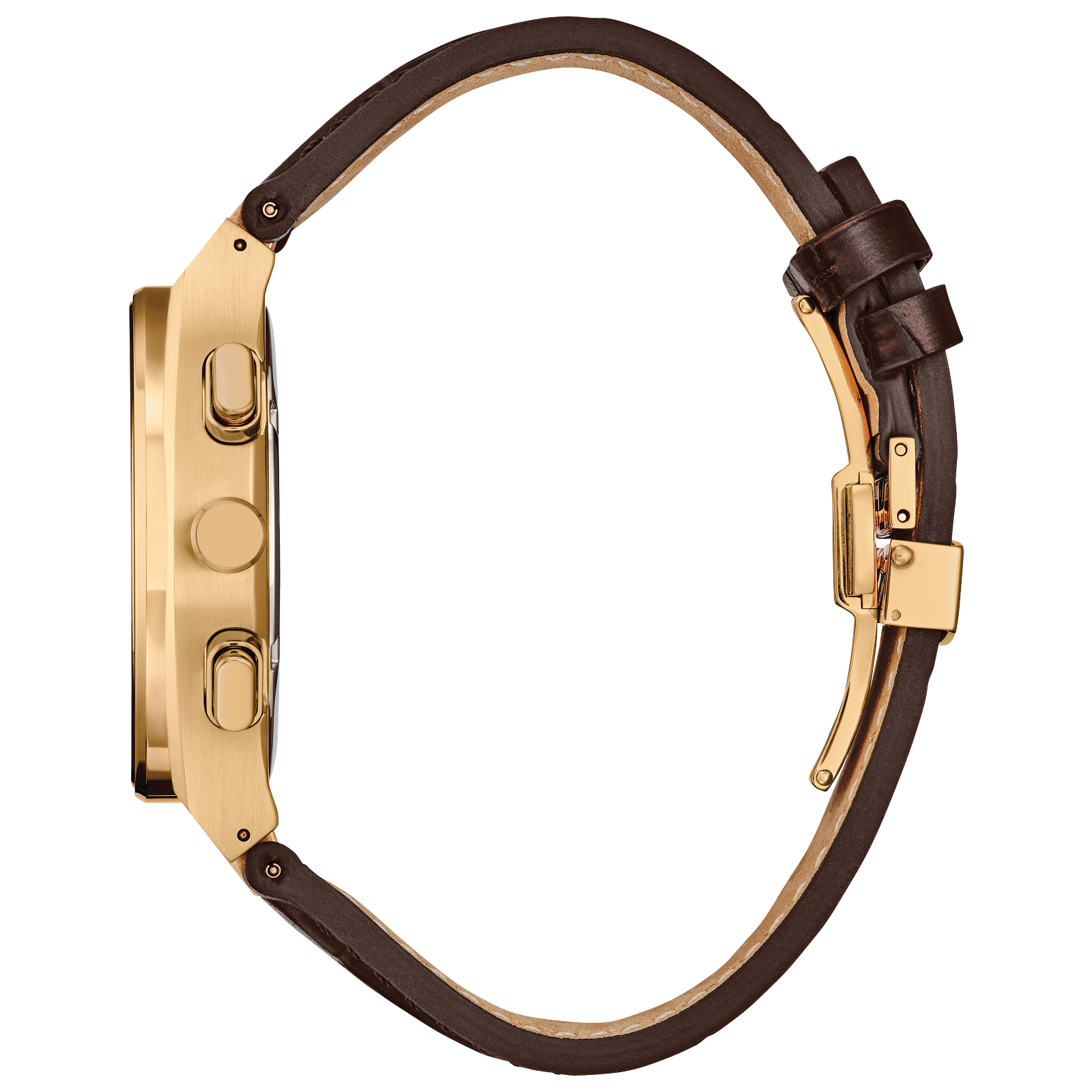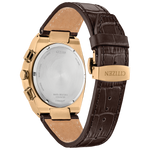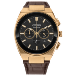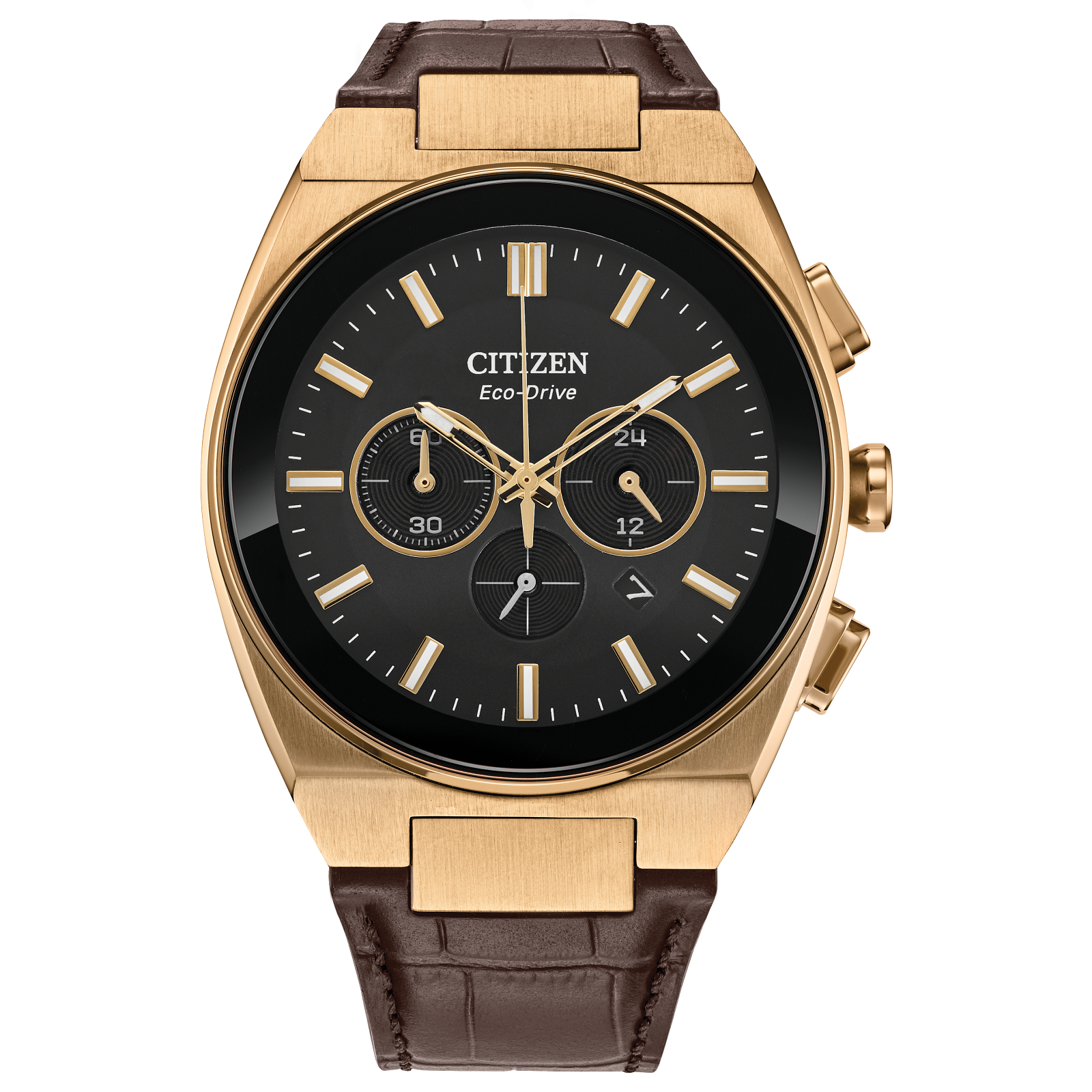 The Citizen Axiom features a sophisticated blend of sports watch aesthetics with refined styling for the ultimate workday to weekend watch to wear. The timepiece features a rose gold-tone stainless steel case with an integrated leather strap, embodying a distinct, contemporary sports watch design. The black dial has a streamlined look, with two sub-dials at 3 and 9 o clock, outlined with more rose gold-tone details to match the style of the applied indices and hands, while an understated 6 o'clock sub-dial for the running seconds rounds out the style. Capabilities of the watch include a 1/5 second chronograph that measures up to 60 minutes, 12- and 24-hour time indication, and a date indicator. Powered by Citizen s proprietary Eco-Drive technology to provide light-powered vitality continuously and sustainably without ever needing a battery. Calibre B620.
