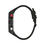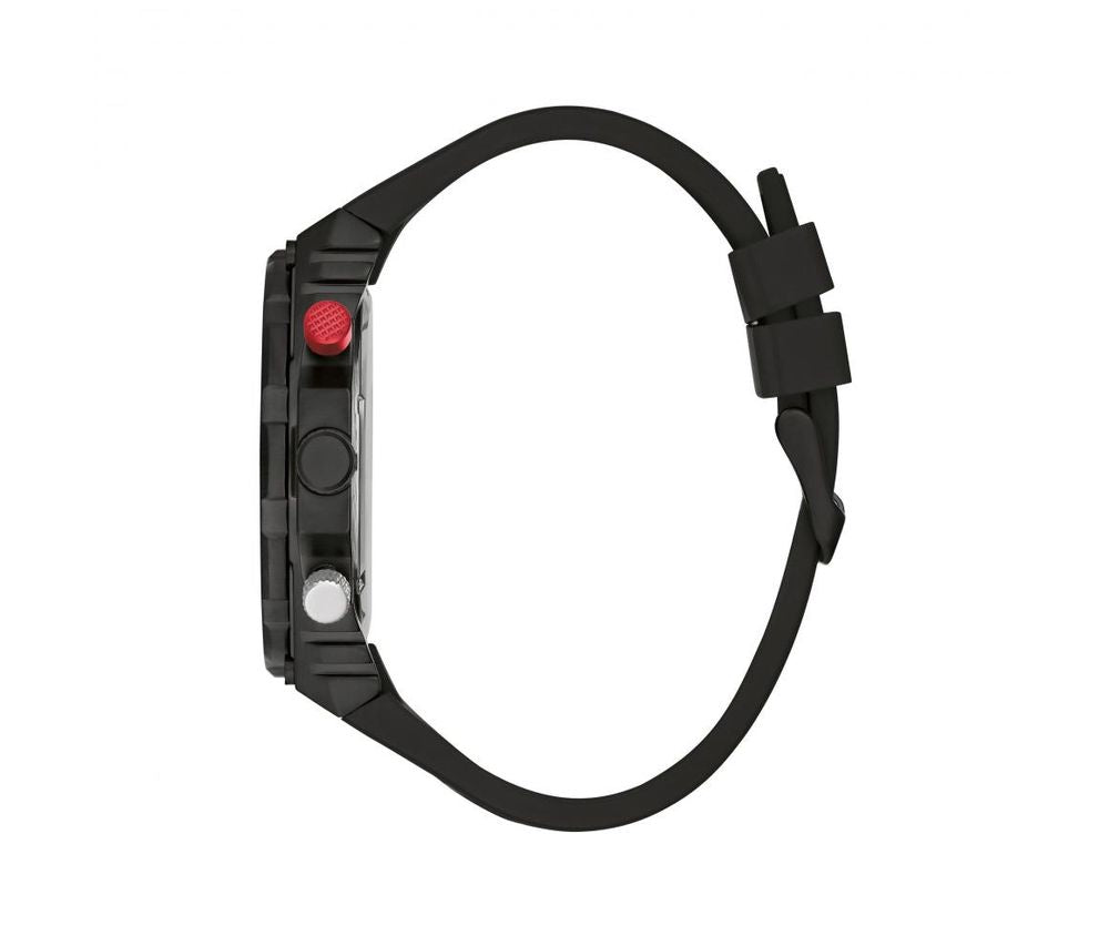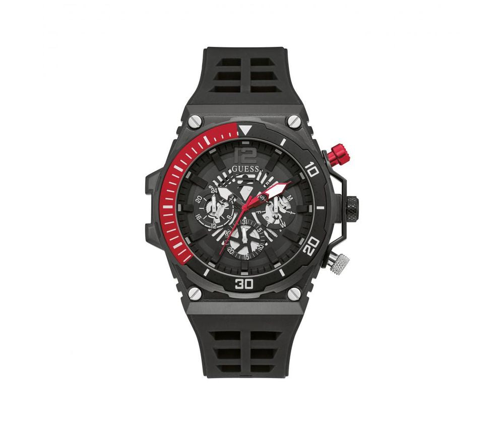 This bold chrono-look timepiece has all the details to make it truly unique, featuring a cut thru dial design with contrast second hand and pushers and a corresponding cut thru silicone strap GW0443G2