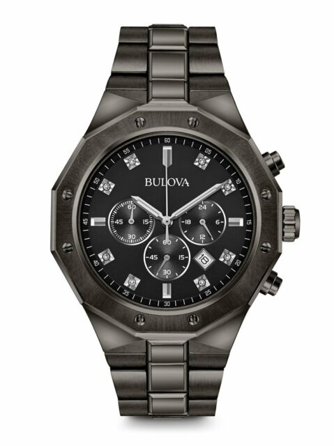 From the Men s Classic Diamonds Collection. New 6-hand chronograph in matte gray IP stainless steel with 8 diamonds individually hand set on black dial, matte and polished gray IP stainless steel bracelet with double-press fold-over buckle closure and safety bar and extender, and water resistance to 100 meters.