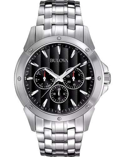 From the Classic Collection. Multifunction design in stainless steel with black patterned dial, day, date and 24-hour sub-dials, second hand, screw-back case, and locking fold-over clasp with safety clasp and extender.