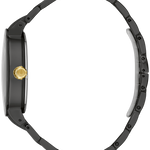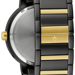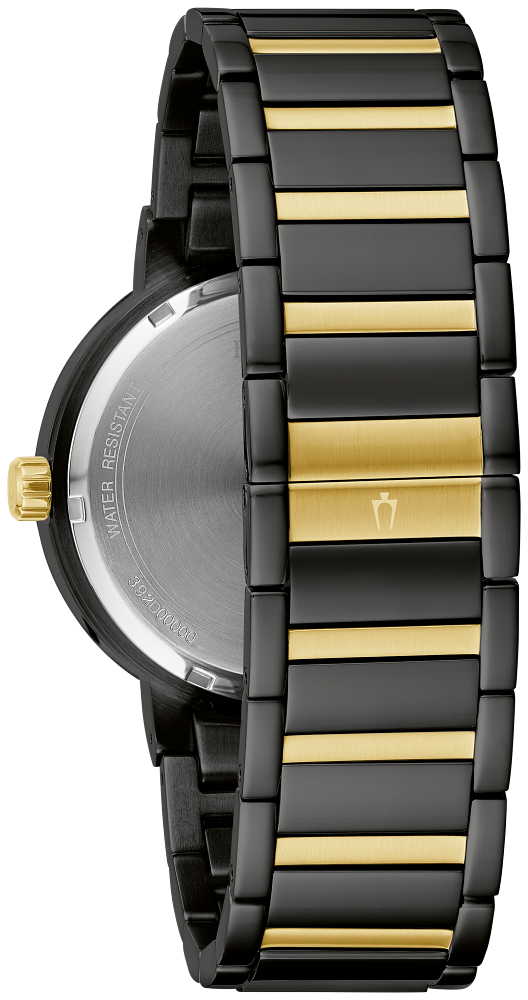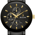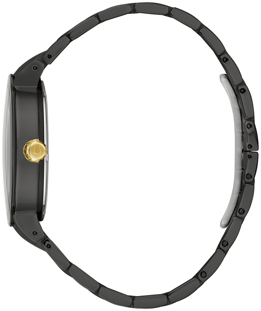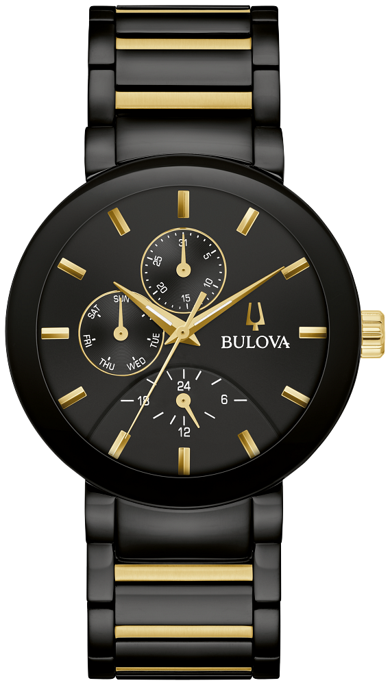The Bulova men s Modern collection breaks the mold by pushing the boundaries of modern watch design. The sleek black IP and gold-tone stainless steel case features an edge-to-edge domed mineral crystal with black metallization for an exceptionally modern look. The mesmerizing black dial features a combination of gold-tone markers and hands with a 24-hour display and registers for the day and date. A multi-link black IP and gold-tone stainless steel bracelet creates a seamless silhouette and has a deployant closure. Uncompromising in its modernity while offering incomparable style, this Bulova men s timepiece is an exquisite companion for any occasion.