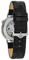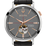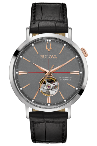 Stainless steel case with rose gold-tone crown at two o clock position, open aperture gray dial with rose gold-tone hands and markers, exhibition case back, automatic heart-beat self-winding movement with 40-hour power reserve, boxed mineral glass, croco-embossed black leather strap with three-piece buckle closure, and water resistance to 30 meters.