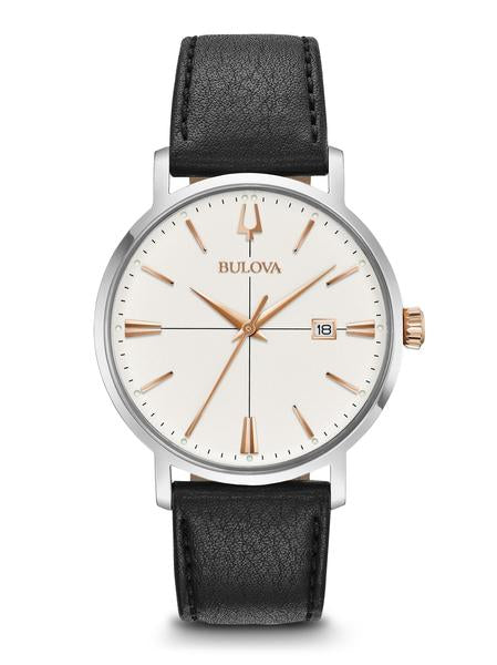 From the Classic Aerojet Collection. Stainless steel case, rose gold-tone crown and accents on silver-white dial with three-hand calendar feature, box mineral glass, smooth grain black leather strap with three-piece buckle closure, and water resistance to 30 meters.