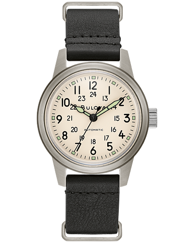 Inspired by Bulova s military heritage and vintage watches of the time, the Hack Watch infuses historical elements for a contemporary lifestyle. The updated style features a three-hand 21-jewel automatic movement with a 42 hour power reserve. The stainless steel case with an ivory dial and luminescent hands and markers also features a center track on the dial displaying 24H time. Black leather NATO strap. Domed mineral crystal. Water resistance to 30 meters.