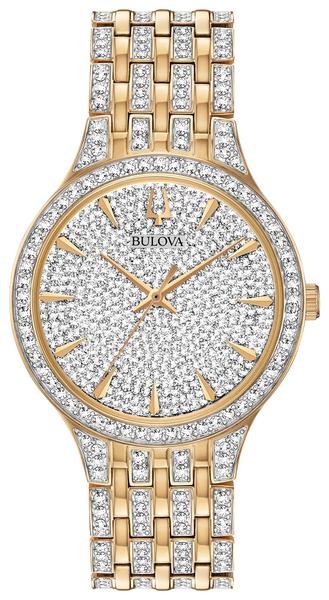 New slim and sleek style embellished with 636 Swarovski Crystals. Gold and silver tone stainless steel case and bracelet and clear pave dial. Watch features a flat mineral crystal, quartz movement, and water resistance to 30 meters.