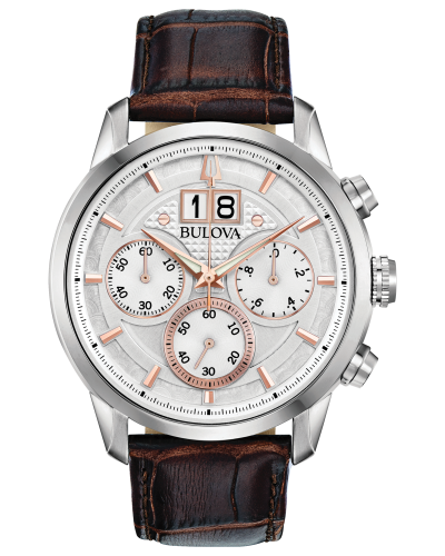 Six-hand chronograph with silver tone stainless steel case and brown leather strap. Silver white dial with rose gold tone accents, featuring an oversized date window at the 12 o'clock position. Watch features a domed mineral crystal, quartz movement, and water resistance to 30 meters.