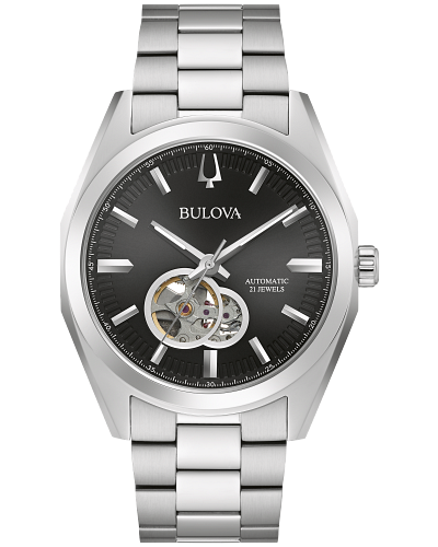Part of the Surveyor line of Bulova watches, this updated classic automatic watch offers all of the detail and quality you would expect in a luxury watch, while staying at an affordable price point. The stainless steel case and bracelet is paired with a rich black dial with silver accents and an open aperture to view the movements balance wheel and escapement. The screw-back case is topped with a mineral crystal exhibition window to showcase the automatic movement powering the timepiece. This beautifully detailed, quality timepiece is destined to become a new favorite in any collection.