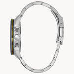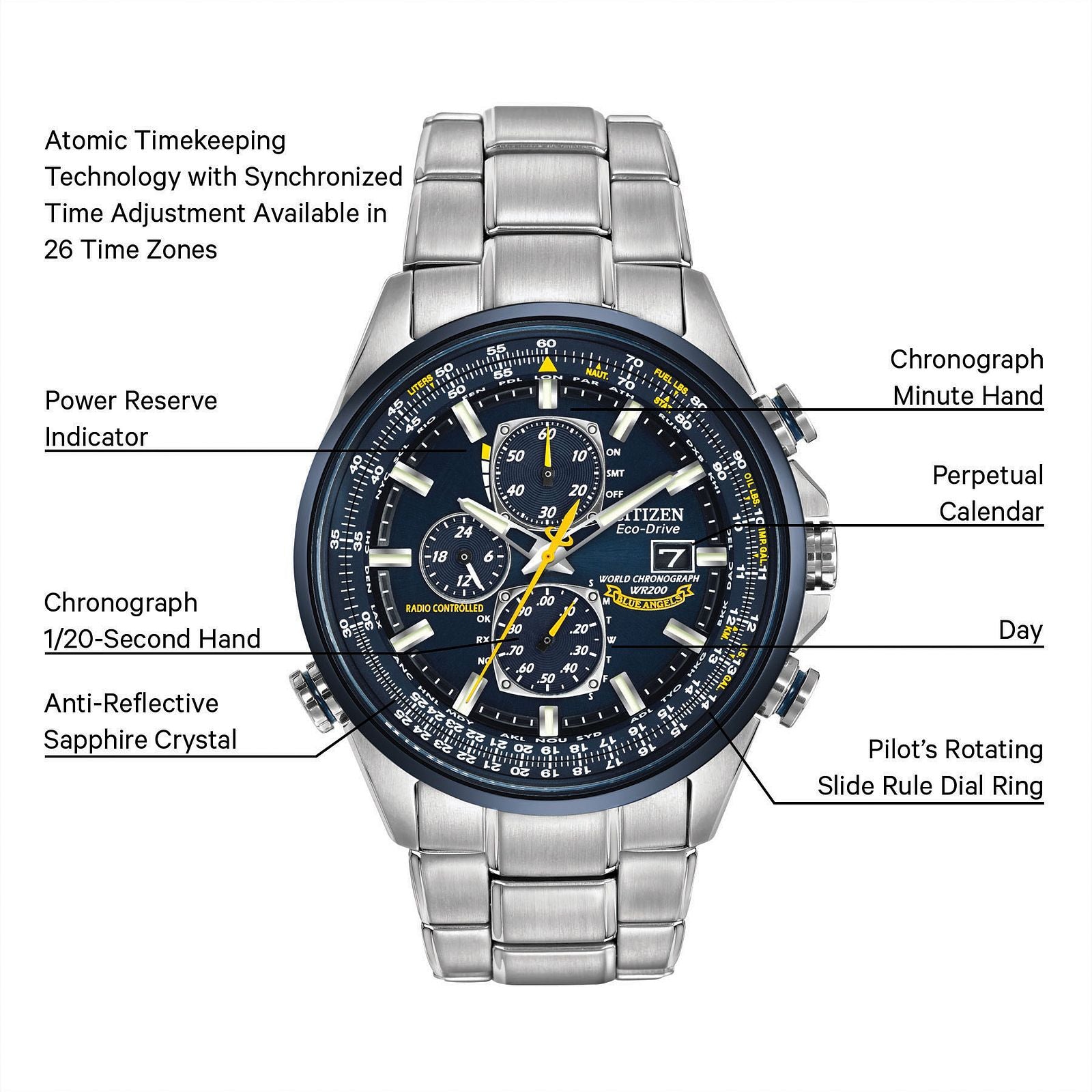 Citizen Eco-Drive Radio-Controlled Chronograph World Timer; Blue Angels edition with caseback insignia. Atomic time in 26 world cities; radio-controlled accuracy in 5 zones. 1/20 second chrono measures up to 60 minutes, perpetual calendar, 12/24 hour time, power reserve, non-reflective sapphire crystal. Stainless steel with blue ion plating. Featuring our Eco-Drive technology C powered by light, any light. Never needs a battery. Caliber number H800.