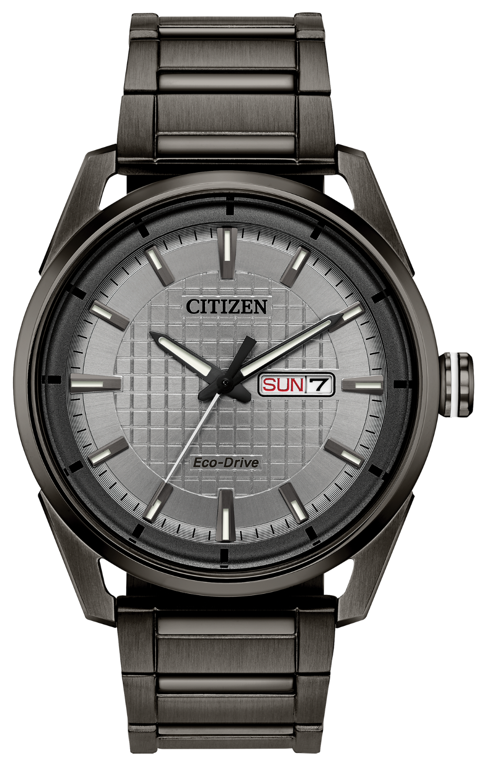 The Drive from CITIZEN CTO collection. A collection of watches with classically modern design. Featured here in a gray ion plated stainless steel with gray dial and day/date. Featuring our Eco-Drive technology C powered by light, any light. Never needs a battery. Caliber number J800.