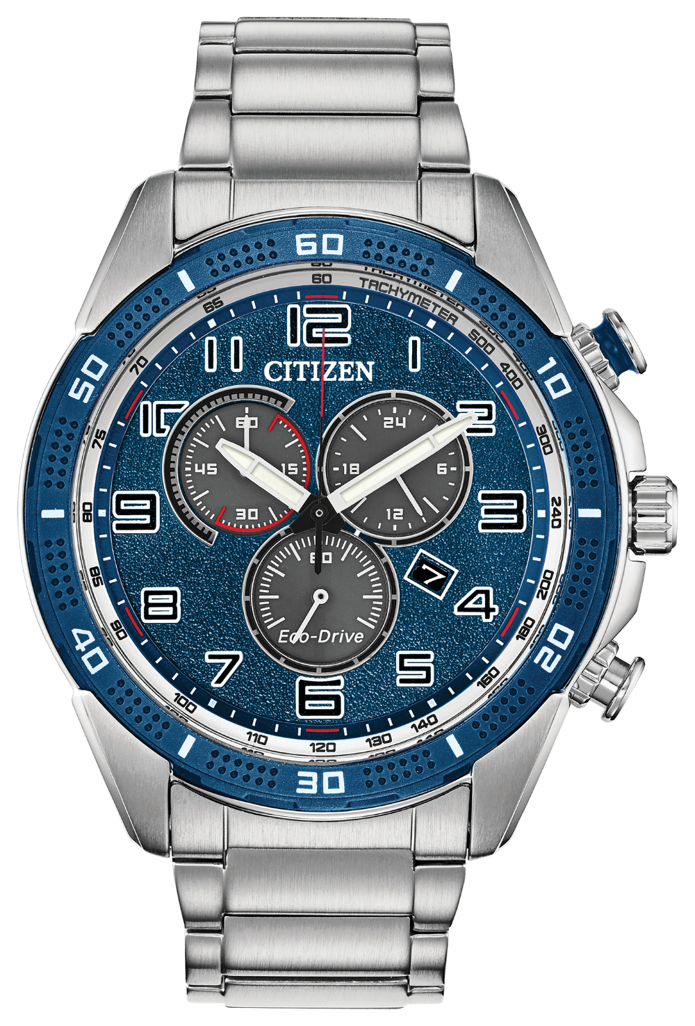 The new Drive from Citizen AR, a laid back feel with classic structure, instantly adding style to any wardrobe. In a stainless steel case with navy blue chroma finishing, stainless steel bracelet and navy blue dial with chronograph and 12/24-hour time. Featuring our Eco-Drive technology C powered by light, any light. Never needs a battery. Caliber number H500.