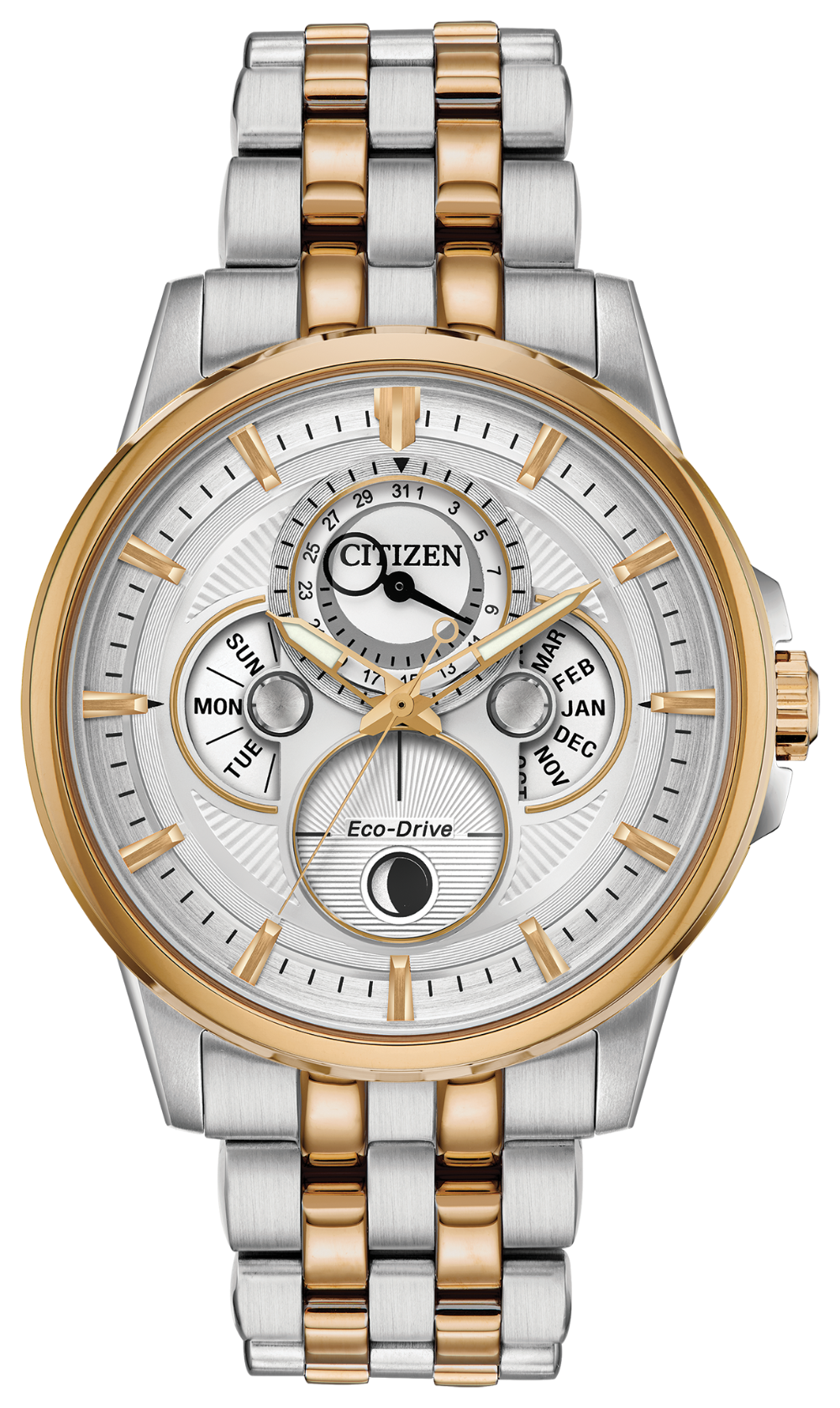 Bring sophistication to your day with the new CITIZEN Calendrier Moonphase, powered by any light with Eco-Drive. This timeless watch features analog month/day/date. Men's watch featured withrose gold two-tone stainless steel case and bracelet with silver dial. Featuring our Eco-Drive technology C powered by light, any light. Never needs a battery. Caliber number 8730.