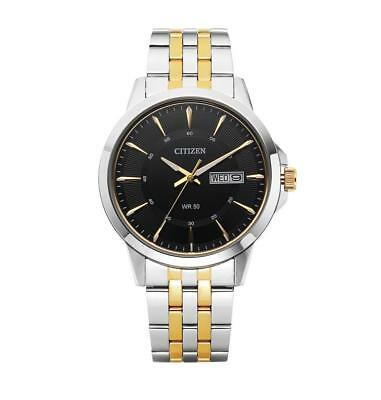 Define your style and keep good time with this analog dress watch from Citizen. It features a stainless steel case and band with a black dial and day-date window that epitomizes elite style and sophistication. This versatile timepiece is water resistant to 50m and looks great with anything from a polo t-shirt to a 3-piece suit.