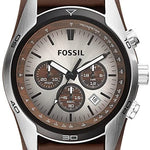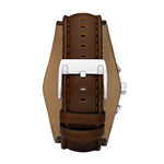 Go casual with this stainless steel watch. The tan dial features wood accents and chronograph movement adds extra functionality. The brown genuine leather strap has silver-tone stud detail and gives this watch a sporty look you'll love.