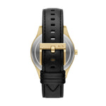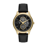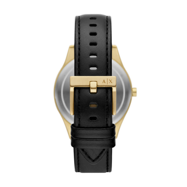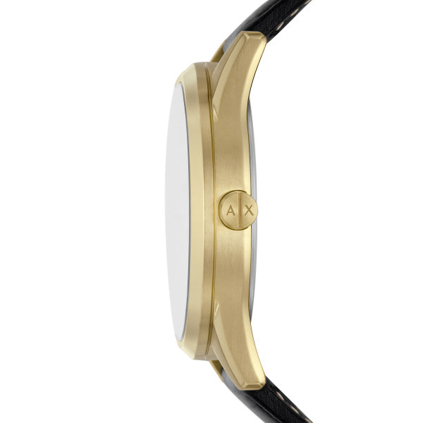 The Armani Exchange Dante Multifunction AX1876 men's watch features a gold-tone stainless steel envelope, which is set with a black dial with sub-dials for daylight saving time, day-of-the-month date and day-of-the-week date. Connected to the envelope is a black leather strap. The working model is powered by a quartz movement.