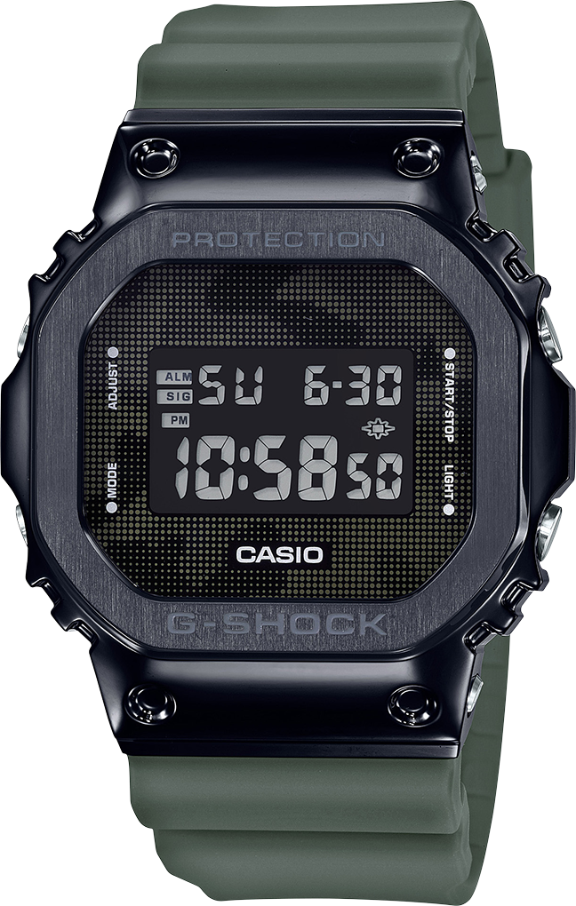 Introducing a new selection of models, that add metal parts to the design of the square-face 5600 Series G-SHOCK, the watch that has been revolutionizing personal timekeeping since 1983.These new modules use resin for the case interior and stainless steel for the bezel cover, creating a look of elegance while maintaining light weight and a great fit to wrist. Light-on-dark LCDs further add to the overall chic look of these timepieces.These new 5600 Series watches maintain the original G-SHOCK concept while improving overall timekeeping quality, designs, and comfort.