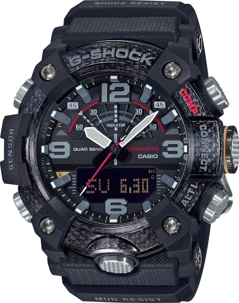 From the MASTER OF G Series MUDMASTER, the watch that is designed and engineered to withstand rough land environments, come carbon resin models that incorporate a new type of structure. The case is made of high-rigidity carbon material to protect against damage and deformation due to impact and other rough treatment, while metal button pipes ensure a tighter seal against the external environment. A filter further protects against the invasion of mud, for the high level of dust and mud resistance required when in severe environments. In addition, the dual back cover consists of a stainless steel panel back and an outer cover made of shock resistant fine resin embedded with glass fibers.