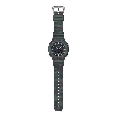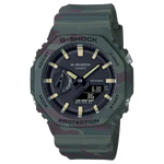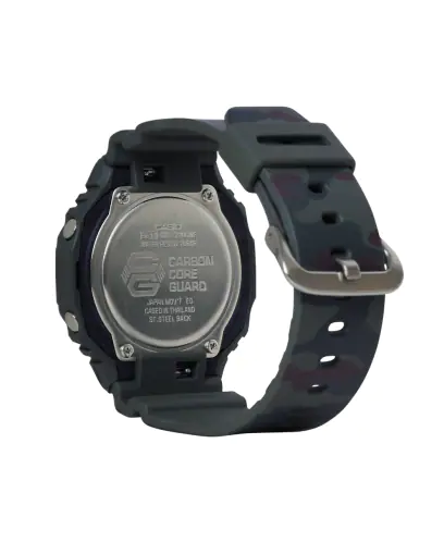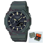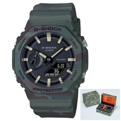 From the toughness-driven G-SHOCK, a design inspired by adventurers whose love of the wilderness knows no bounds. Switch between interchangeable bands and bezels for a thin octagonal GAE-2100 with an even wilder spirit. Green nature-inspired camouflage and vibrant outdoor-fashion orange take you from fashionable urban streets to wilderness exploration in cool, casual style.
