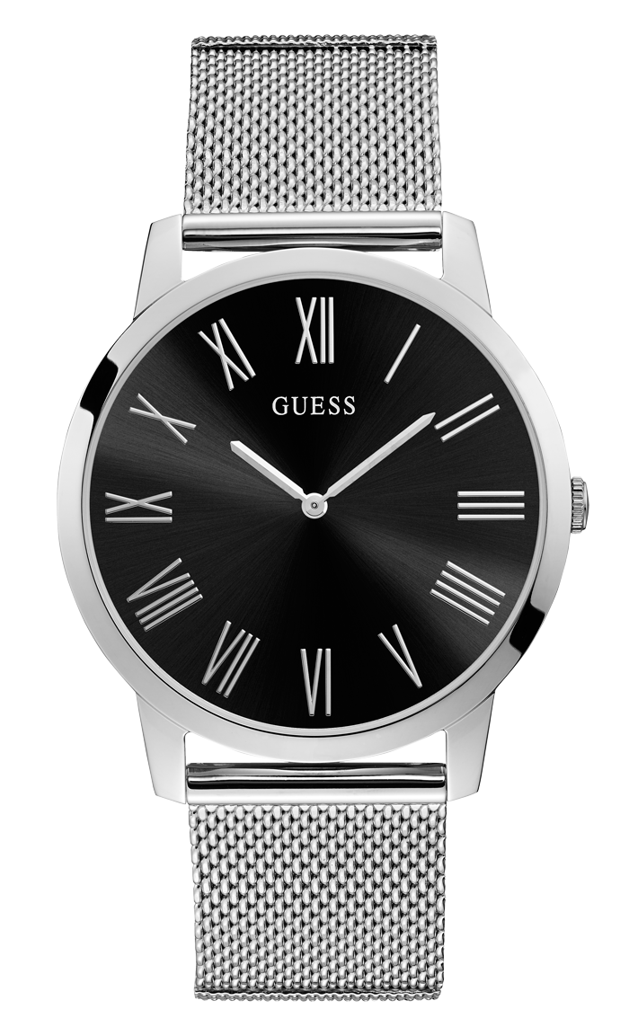 Stay sharp with this silver-tone analog watch, featuring a mesh bracelet, black dial and matching silver-tone case.