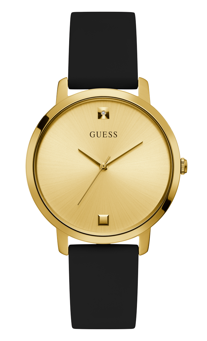 Sophisticated watch option featuring a sleek gold-tone dial with genuine diamond at the 12 o'clock mark. Finished with a smooth black silicone strap with buckle closure.